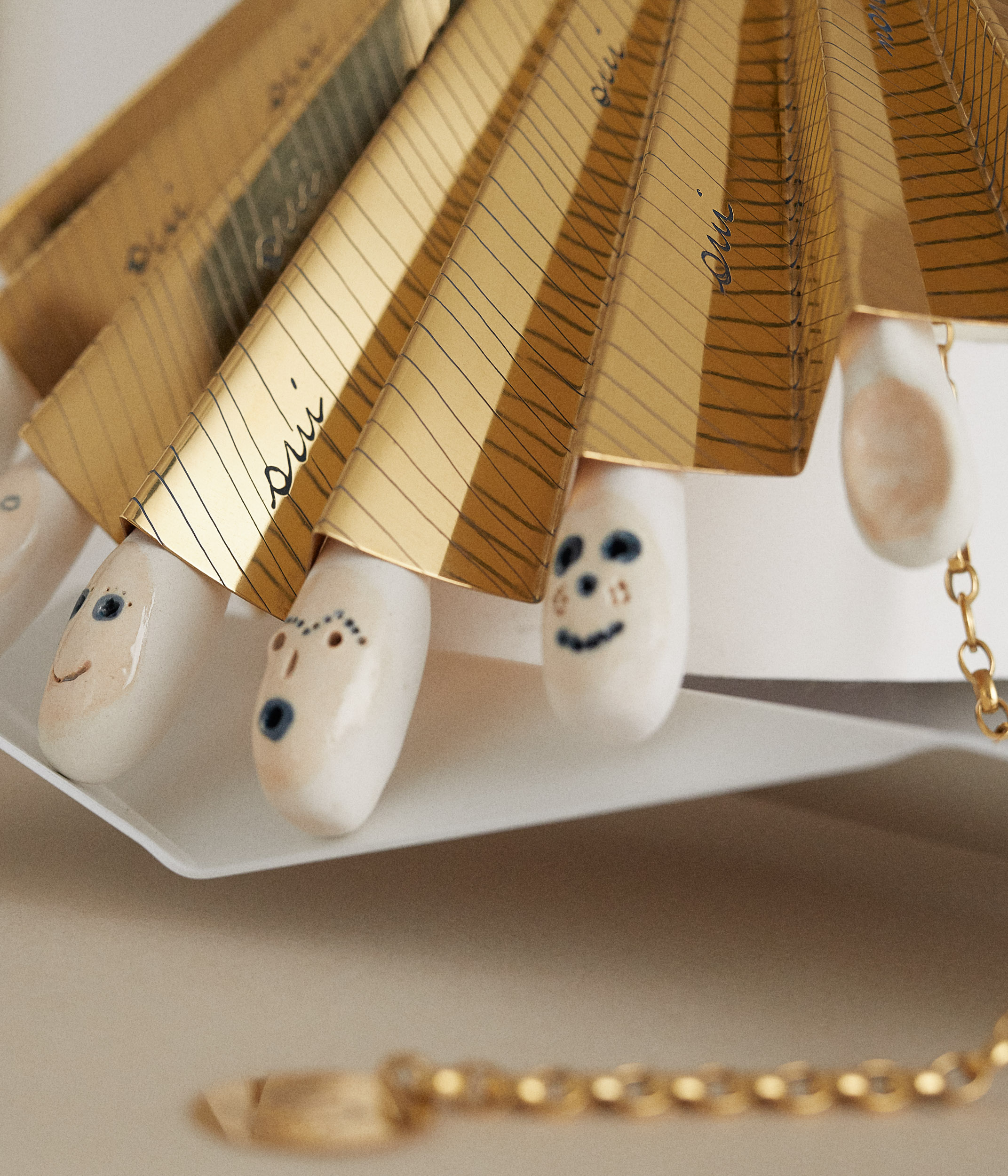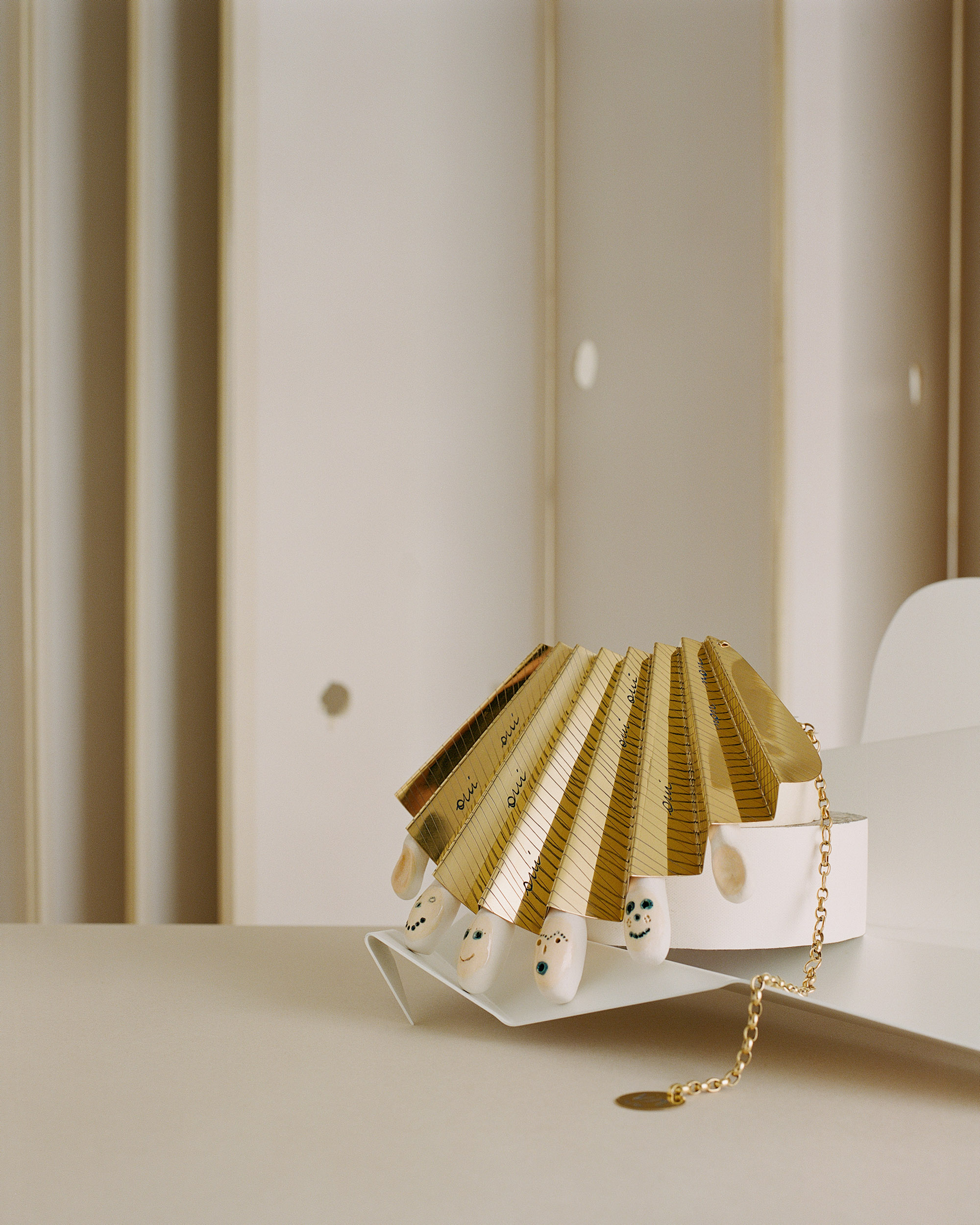Créées par Nathalie Guiot, les Editions Thalie soutiennent la création de bijoux d'artistes en édition limitée depuis plusieurs années. Sculptrice autant que peintre, l’artiste belge Valérie Mannaerts a imaginé pour cette saison 2020 Private Architecture (oui oui non non), une parure inspirée du bijou pectoral précolombien dans la découpe à la feuille. Un bijou singulier lié à l’univers plastique de l’artiste : l’ornement et le fantasque. Private Architecture (oui oui, non non), se déploie comme un éventail. Tel un talisman, il révèle et protège avec ses amulettes en céramique représentant de petits fantômes ou des cuillères comme des good lucks charms.